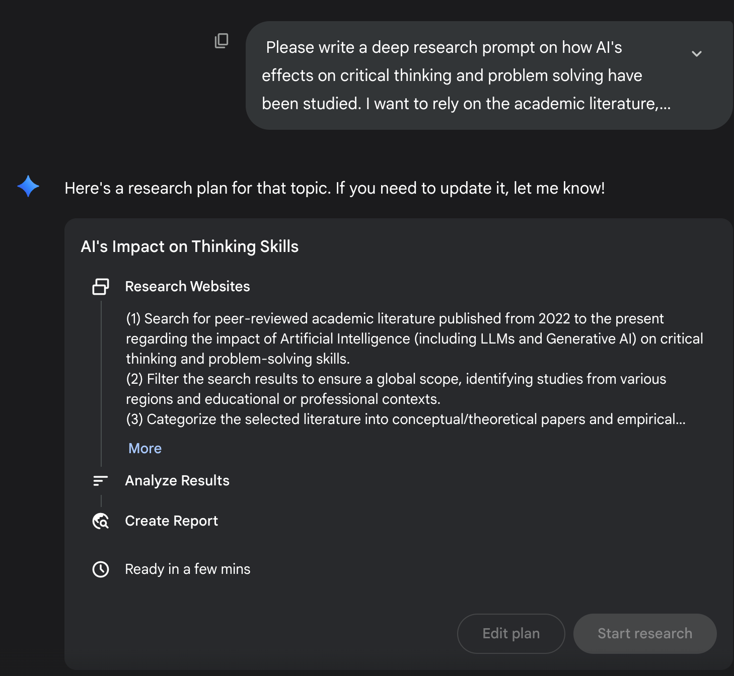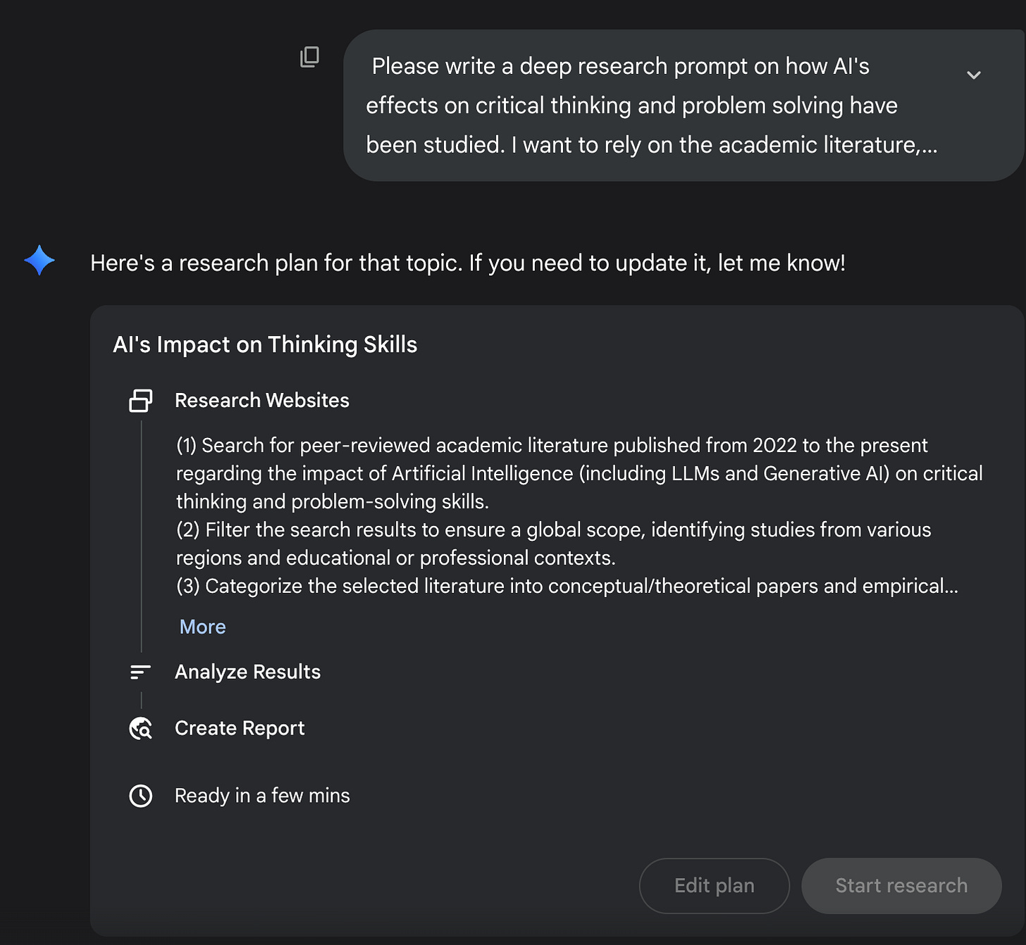 So I did as I normally do, described what I wanted in the report, and then asked Gemini to write the prompt for me. What happened next both surprised and frustrated me. Rather than giving me the prompt, which Gemini had done dozens of times before, it immediately launched into the deep research report. (The way Gemini does deep research is to first specify its plan, which you can edit if you’d like.)